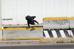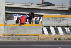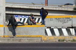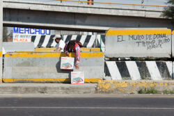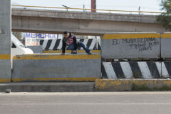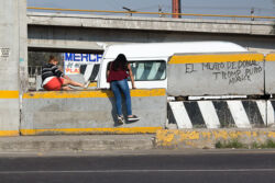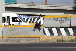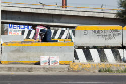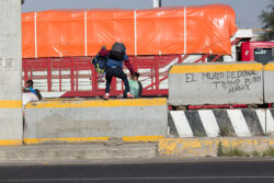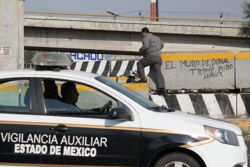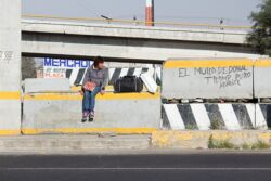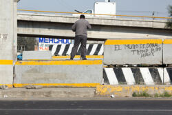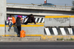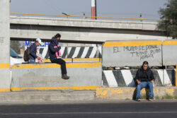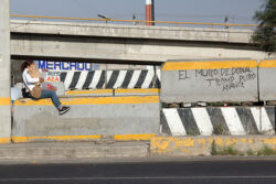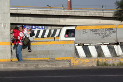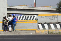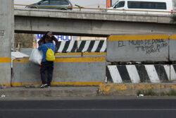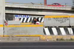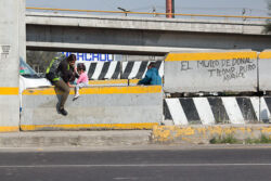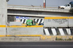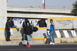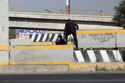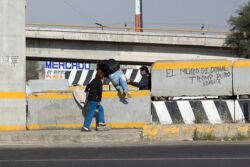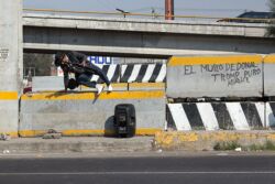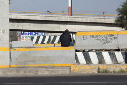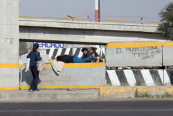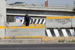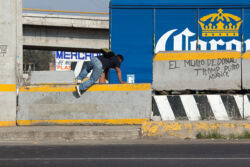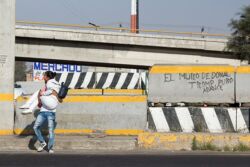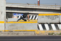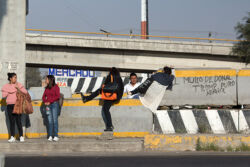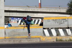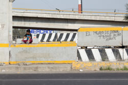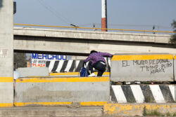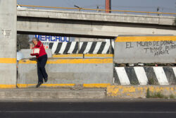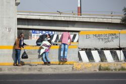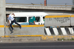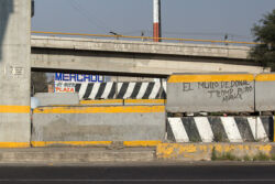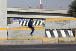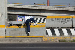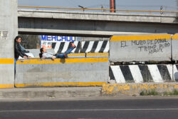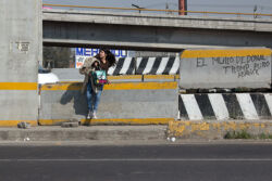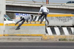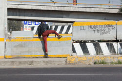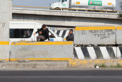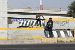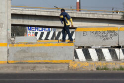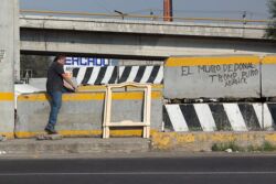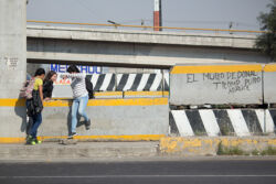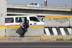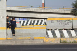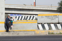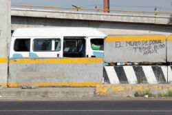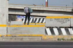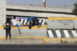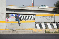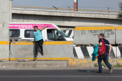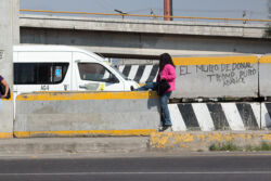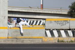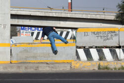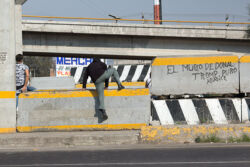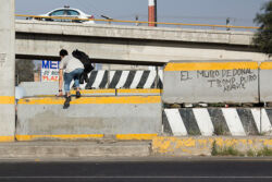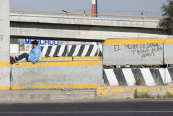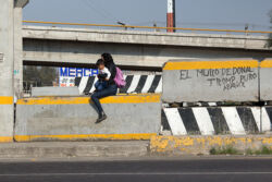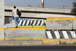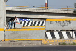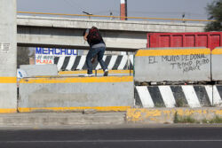 Diariamente habitantes de varios municipios de la zona Oriente del Estado de México saltan por encima de un muro de contención, ubicado en el distribuidor vial Chalco-Ixtapaluca, a la altura de la caseta de cobro de Chalco. En él está inscrita la frase: “EL MURO DE DONAL TROMP PURO ABANCE”. Las personas tienen que llegar a este sitio para poder tomar las distintas rutas que recorre el transporte público, necesarias en su movilidad cotidiana. Para cruzar tienen que correr y esquivar los automóviles que van a gran velocidad. Algunos de los testimonios que recogí en el lugar afirman que anteriormente allí se localizaba un pequeño paradero de combis, sin embargo, con las recientes obras públicas no se contempló su reubicación. En su lugar, se construyó un enorme puente peatonal que no cuenta con accesos a los puntos en donde la gente asciende y desciende del transporte público.